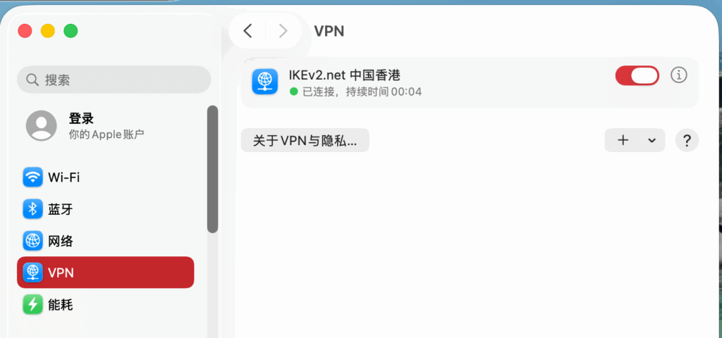 此时设置侧边栏会出现 VPN 选项,点击后在右侧选取您创建的 VPN,打开开关即可连接